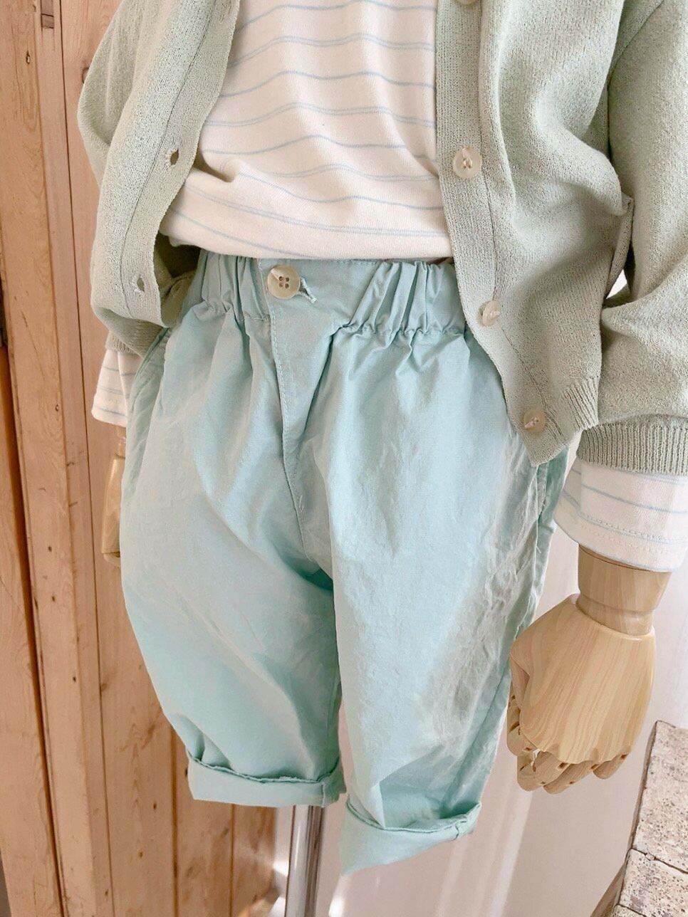 カラーのきれいさが際立つワンボタンデザインのパンツ。